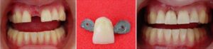 - Βλέπετε την εικόνα του στόματος με το δόντι που λείπει, την γέφυρα Maryland με το χαρακτηριστικό της σχήμα πριν την τοποθέτηση της στο στόμα και την γέφυρα τοποθετημένη στο στόμα.Η γέφυρα σε αυτή την περίπτωση αφαιρείται και επανατοποθετείται από τον οδοντίατρο σε όλα τα ενδιάμεσα στάδια κατασκευής της οριστικής αποκατάστασης στο οδοντικό εμφύτευμα.